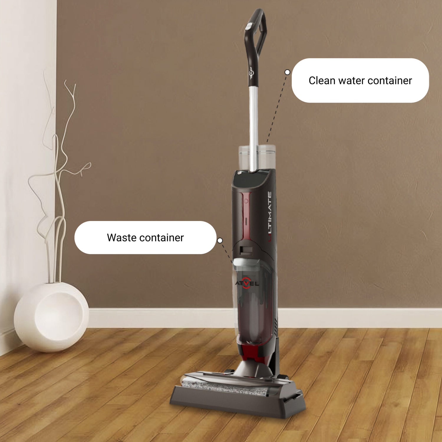 Atvel F16 Ultimate is equipped with two containers: for clean water with a capacity of 680 ml and for dirty water with a capacity of 450 ml. Well-designed volume does not weigh down the vacuum cleaner during cleaning and at the same time it allows you to spend the maximum amount of liquid required for perfect cleanliness.